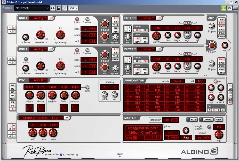 Rob Papen Albino 3Albino 3 is the latest in the Albino line of synthesizers from LinPlug with design and presets by famed preset designer Rob Papen. It consists of 4 oscillators, each of which can be 'analog' (ie saw or square with pulse width modulation), wavetable, noise, or 'audio input' (ie processing the incoming audio). There are 2 filters, with 4 filter types each, a very flexible modulation matrix, and a whole host of effects. In it's latest incarnation it also supports layering up to 4 sounds together, giving a theoretical 16 oscillators. Albino is traditionally thought of as being a 'trance' synthesizer, especially with it's very flexible arpeggiator. Whilst many of Rob Papen's presets are very apt for trance music, it's possible to get plenty of other sounds out of Albino too and in fact it would work well for any genre. It's hard to find any ommisions ... I would say that I find it harder than something like Rapture or Zebra to some of the really fat distorted sounds I like, but for pretty much any other kind of synth sound it's spot on. Albino costs $200, which is fairly expensive for a softsynth, but it is a premium product. Go to the Albino homepage